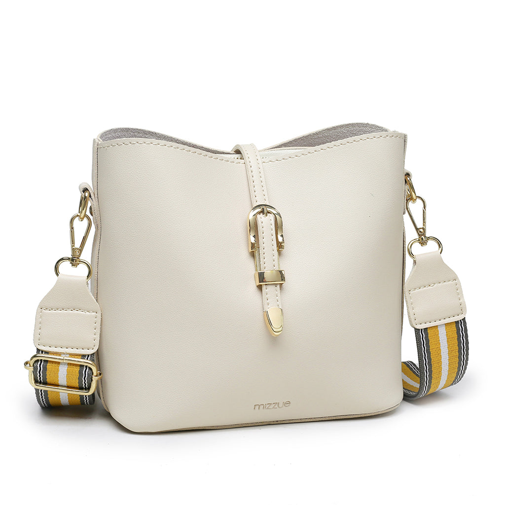 白色彷皮特色扣帶設計條紋肩帶水桶形斜背包
