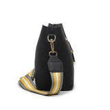 黑色彷皮特色扣帶設計條紋肩帶水桶形斜背包