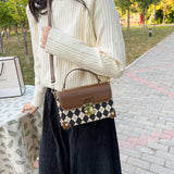 啡色彷皮翻蓋金屬夾扣護角細節格子紋帆布手提斜背包